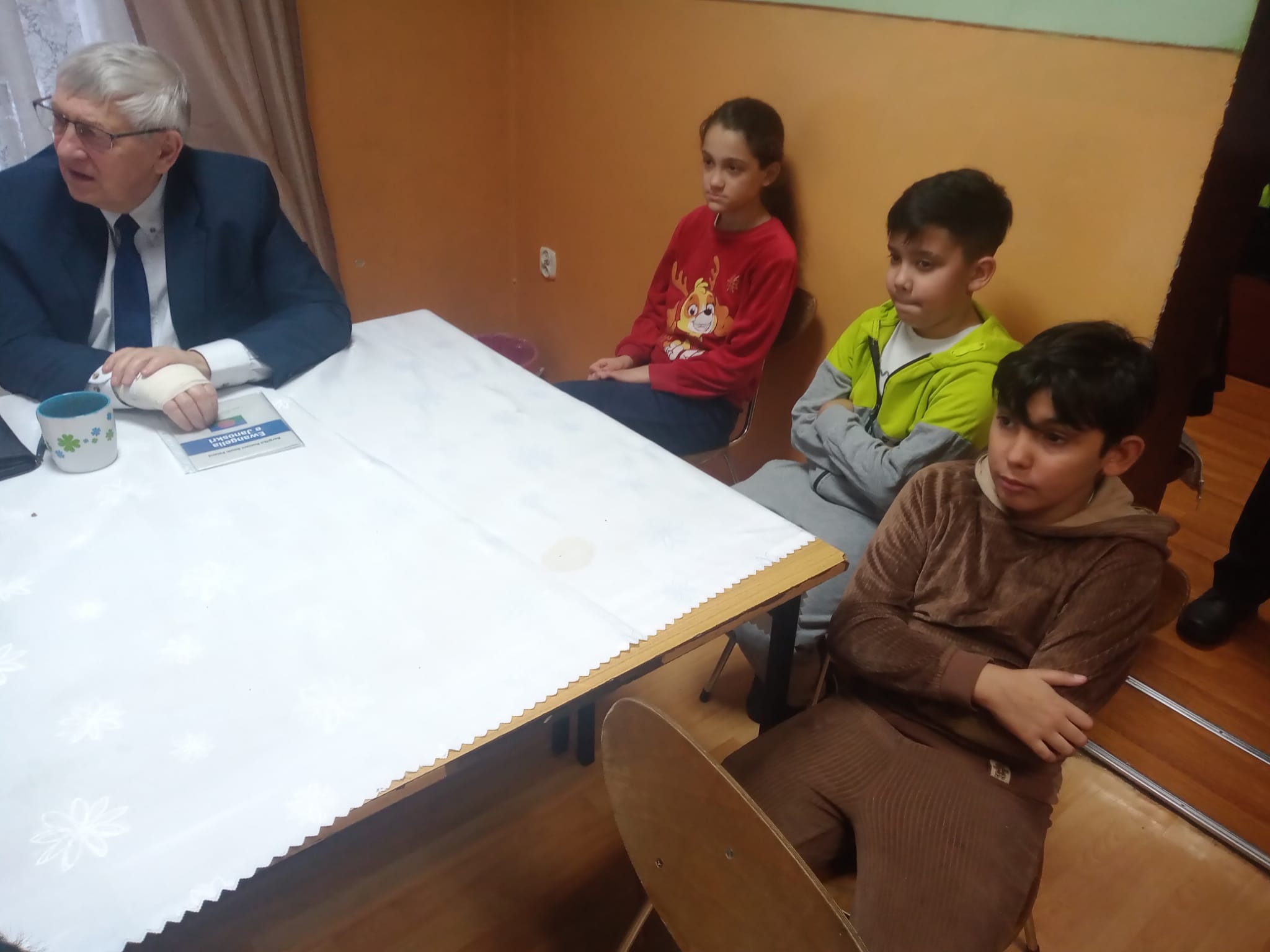 Z kolei starsza grupa dzieci wysłuchała „relacji” Józefa, męża Marii, o NARODZINACH ZBAWICIELA. Poznaliśmy wydarzenia EWANGELII od informacji, która zaszokowała Jozefa, że zaręczona z nim Maria spodziewa się DZIECKA. Kiedy Józef nieomal był gotowy rozstać się z Marią, zainterweniował Bóg, który przez anioła upewnił Józefa, że stało się to za sprawą DUCHA ŚWIĘTEGO, A TO DZIECKO JEST SYNEM BOŻYM. Józef miał przywilej nadać Mu IMIĘ JEZUS, które oznacza BÓG ZBAWIA. „ON BOWIEM ZBAWI LUD SWÓJ OD JEGO GRZECHÓW”. Kiedy Józef z Marią spodziewają się narodzin Tego DZIECIĄTKA, muszą odbyć długą podróż do Betlejem, aby wziąć udział w spisie ludności. Potem szukają miejsca na nocleg, gdzie Maria mogłaby urodzić DZIECIĄTKO. Ostatecznie przychodzi na świat BOSKIE NIEMOWLĘ, SYN BOŻY, którego Maria kładzie w prostym żłobie, z powodu braku miejsca wśród ludzi. Józef „opowiedział” o niespodziewanej wizycie pasterzy, którym anioł Pański oznajmił NARODZINY ZBAWICIELA. Józef z Marią są zdumieni relacją pasterzy o objawieniu anioła Pańskiego, jego słowach i uwielbianiu Boga przez zastępy aniołów. Pasterze przyszli, aby pokłonić się ZBAWICIELOWI. Z kart Biblii wiemy, że SYN BOŻY NARODZIŁ SIĘ, aby później wziąć na Siebie nasze winy i umrzeć za nas na krzyżu. TYLKO ON może pojednać nas z BOGIEM, oczyścić nas z grzechów I darowac nam ŻYCIE WIECZNE. Czy przyjęliśmy już PANA JEZUSA JAKO SWOJEGO ZBAWICIELA ?